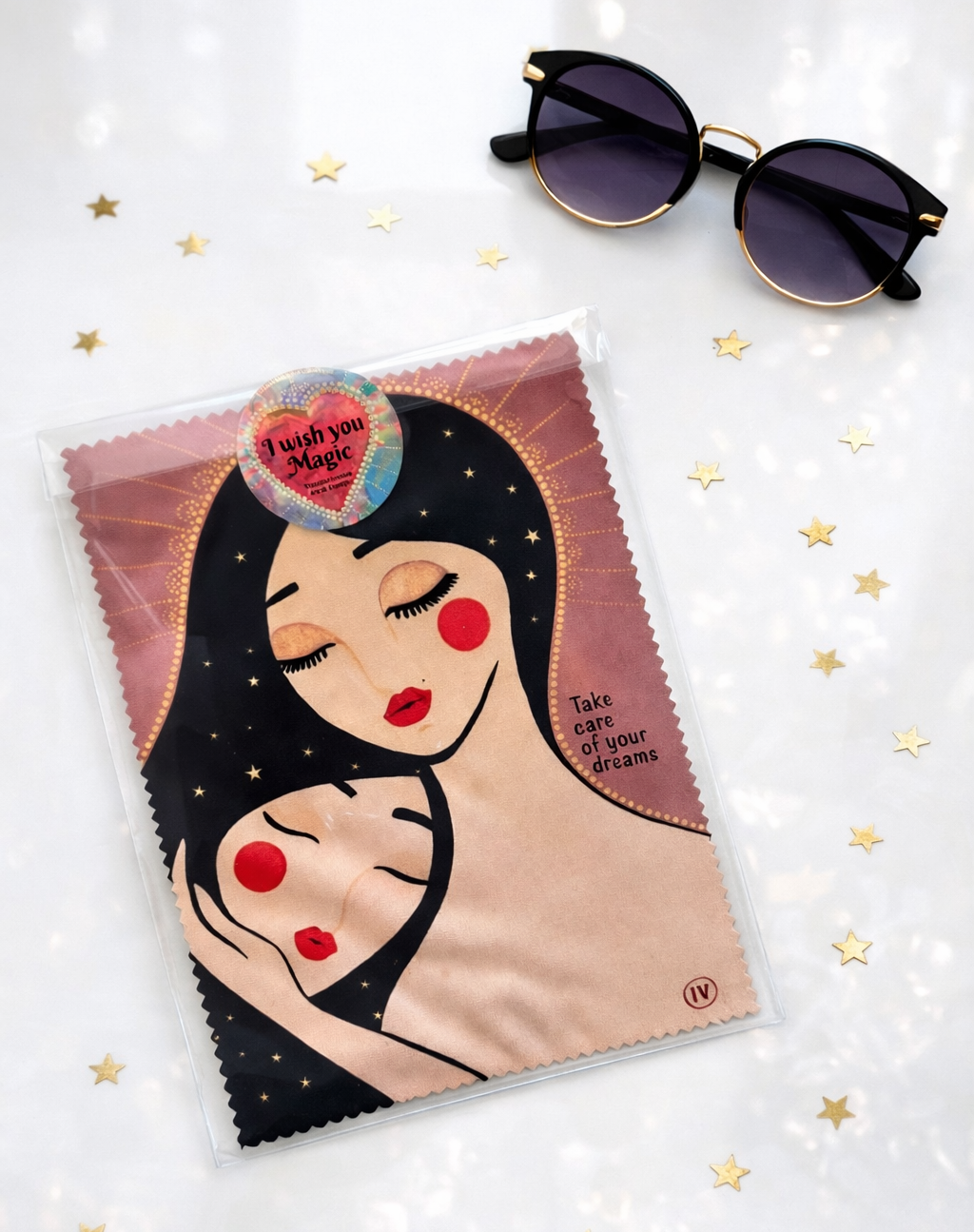 Confezione: Â Panno in microfribra d’arte + Cartolina con messaggio + Certificato di magia con dedica > in bustina trasparente con adesivo “I wish you magic”